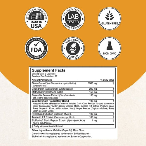 Advanced Glucosamine formula fortified with Chondroitin, Boswellia, Collagen, MSM, Turmeric, Ginger, and Boron for extra strength, flexibility, and comfort of movement. Formulated for all-round joint and cartilage health.*